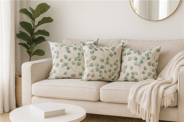 An intricate leaf design printed on a cream base cloth. 85% Cotton, 15% Polyester.