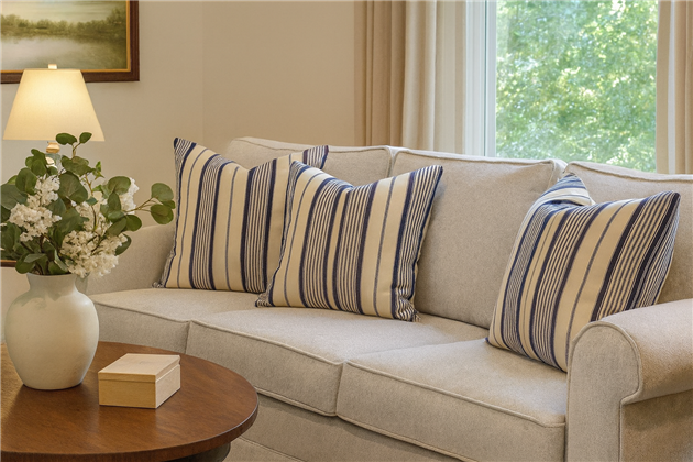 Empire 01 Stripe Navy is one of Ian Mankin’s original designs, firmly establishing it as a classic stripe that stands the test of time. This dense herringbone is woven in 100% cotton and delivers durability, and makes it highly practical for upholstery, curtains, blinds, cushions and home accessories.