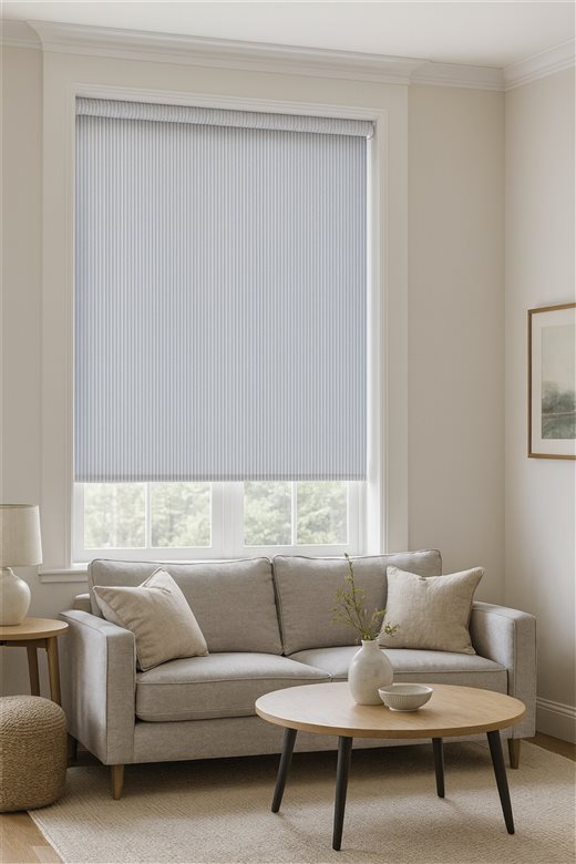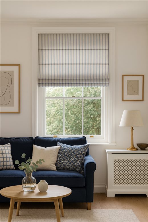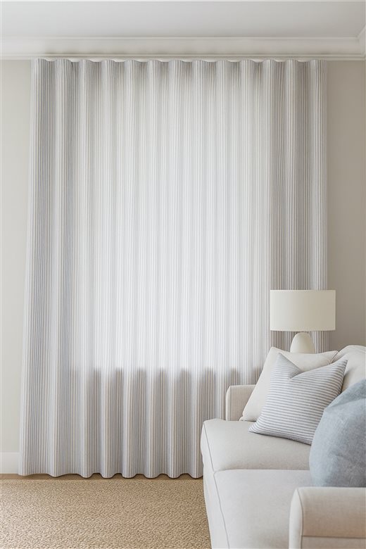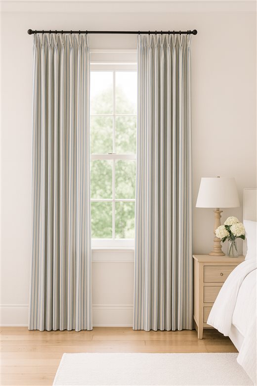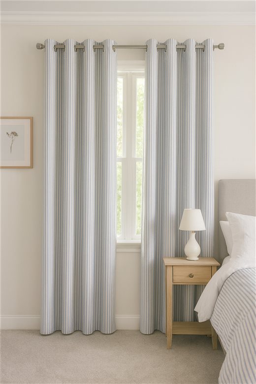 Thailia has a blue striped repeated pattern on a stone background. Made from 85% Cotton, 15% Polyester, this fabric is perfect for any settings. Ideal for handmade curtains and blinds.