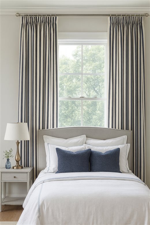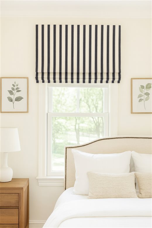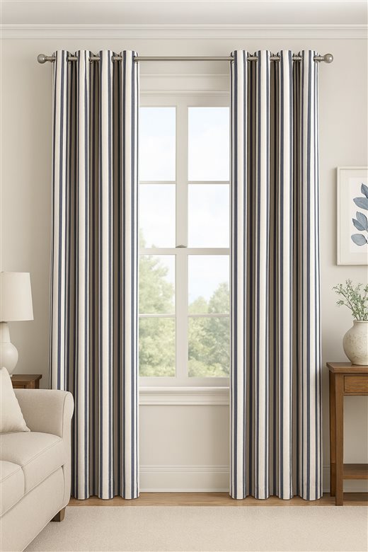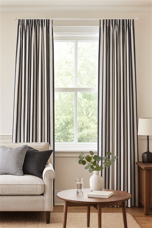 A classic design, Ticking Stripe 2 Dark Navy is a traditional ticking stripe fabric comprising deep rich navy and warm white tones. The dense herringbone weave, which features centralised Ian Mankin ticking stripes in this design, delivers durability and makes it highly practical for upholstery, curtains, blinds, cushions and home accessories.