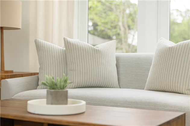 Odell has a stone background with a repeat stripe design in green tones. Made from cotton.