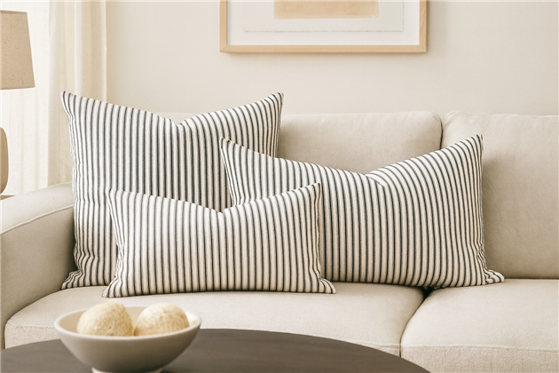 A classic design, Ticking Stripe 1 Black is a 100% cotton ticking stripe fabric comprising cool inky black and warm white tones. The dense herringbone weave, which features centralised Ian Mankin ticking stripes in this design, delivers durability and makes it highly practical for upholstery, curtains, blinds, cushions and home accessories.