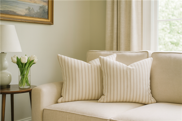 A classic design, Ticking Stripe 1 Oatmeal is a traditional ticking stripe fabric comprising warm beige and crisp white tones. The dense herringbone weave, which features centralised Ian Mankin ticking stripes in this design, delivers durability and makes it highly practical for upholstery, curtains, blinds, cushions and home accessories.