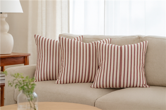 A classic design, Ticking Stripe 1 Peony is a traditional ticking stripe fabric comprising vibrant Peony and warm white tones. The dense herringbone weave, which features centralised Ian Mankin ticking stripes in this design, delivers durability and makes it highly practical for upholstery, curtains, blinds, cushions and home accessories.